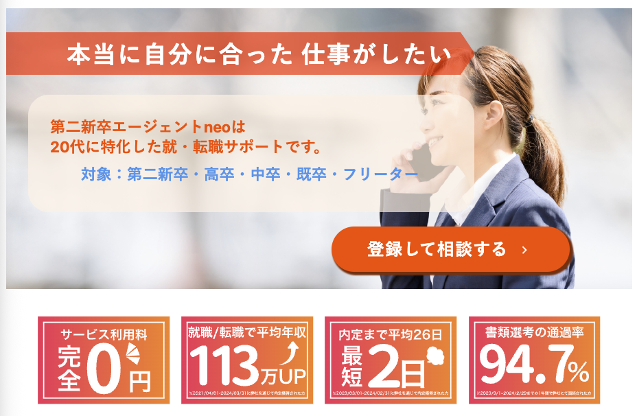 運営しているのは、株式会社ネオキャリア。人材紹介業界では大手の部類に入り、長年若年層のキャリア支援を行ってきた実績があります。「第二新卒エージェントneo」はその名の通り、20代の第二新卒・既卒・フリーターに特化した専門チームです。